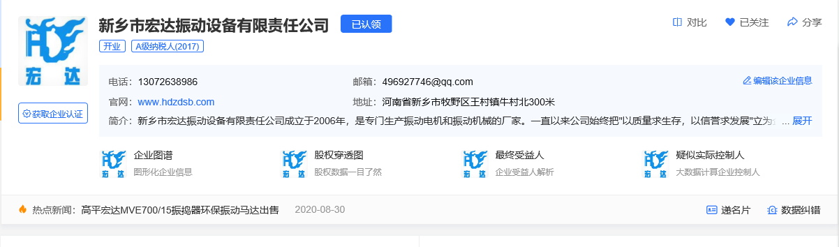 恭喜新鄉市宏達振動設備有限責任公司獲得了“中級名片”企業認證2021-04-23